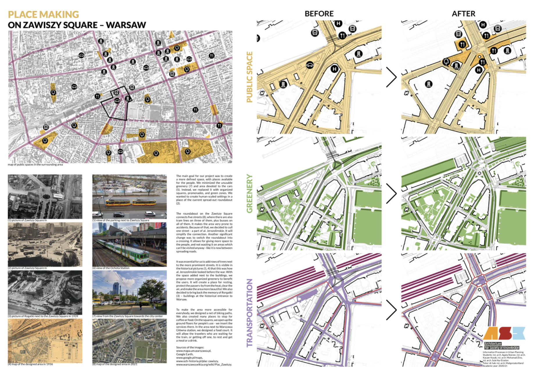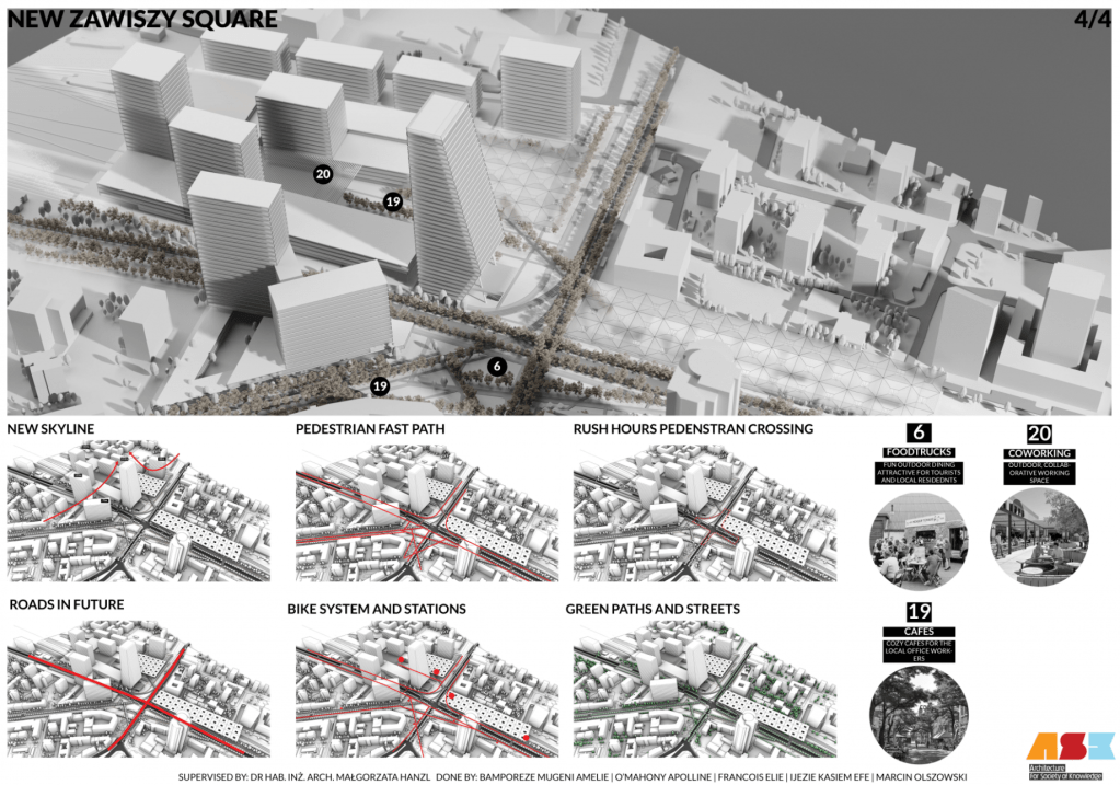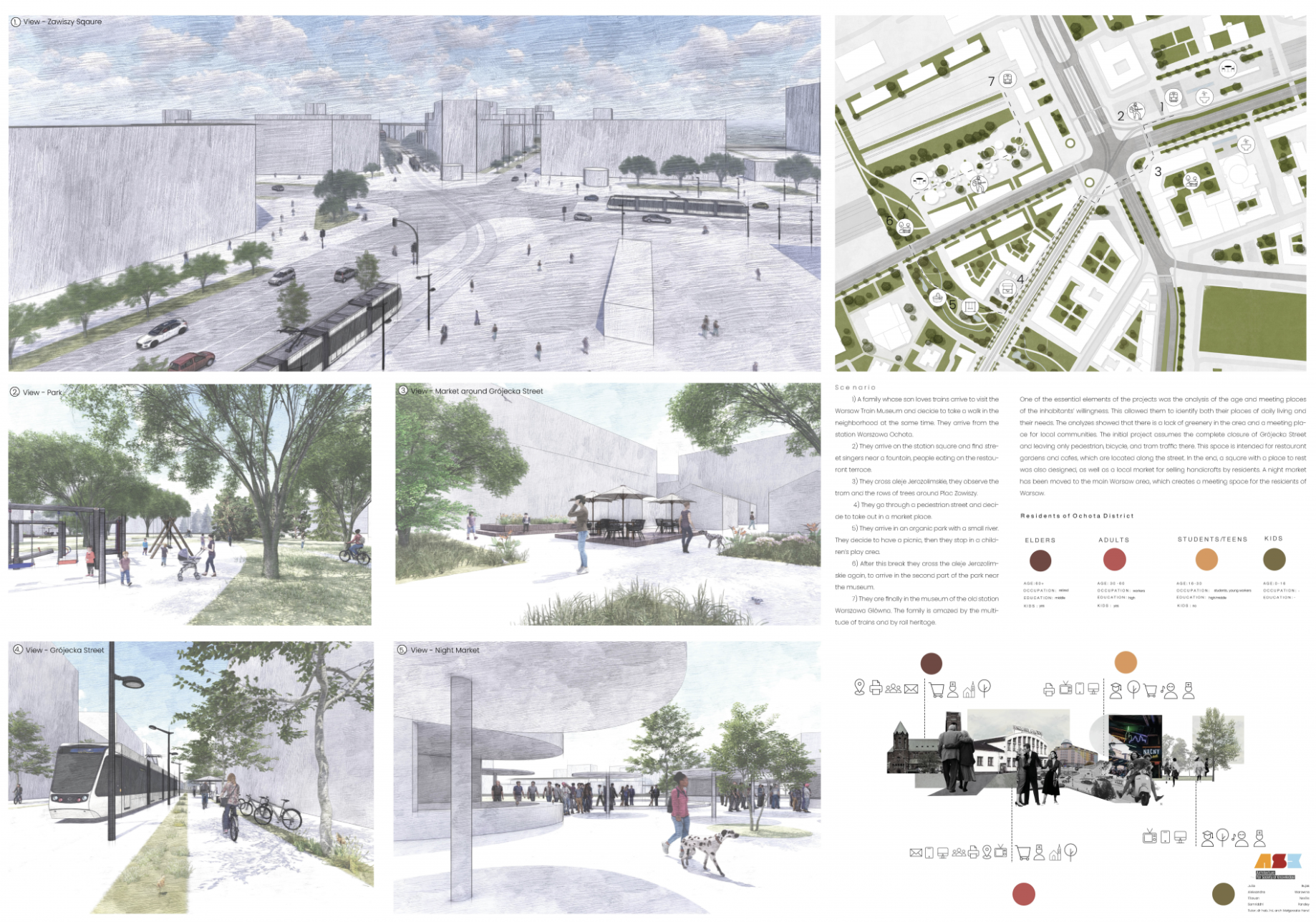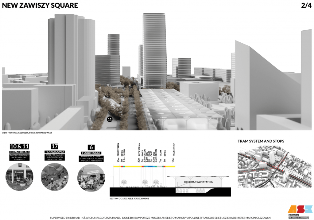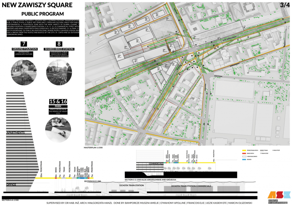 This summer semester, a group of students from the Faculty of Architecture, Warsaw University of Technology, Architecture for the Society of Knowledge MArch Course continued the work on Zawiszy Square. The project is being done in collaboration with the Warsaw Municipal Planning Office. It covered the area of the local plan of urban development enlarged to cover the direct surroundings of Zawiszy Square. The future multimodal transportation node presents multiple challenges, which we were looking to solve.