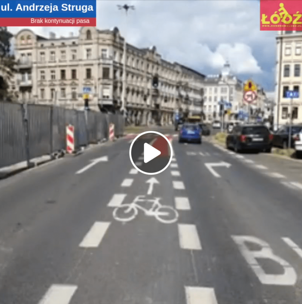 Innym podobnym zagadnieniem jest skala lub zasięg/kompleksowość rozwiązań rowerowych. I tak tu i ówdzie pojawia się fragmencik rowerowej ścieżki, aby przy kolejnym skrzyżowaniu zniknąć bezpowrotnie. Jednym z ciekawszych takich odkryć niedawno jest ten w ulicy Andrzeja Struga, pomiędzy ulicą Skłodowskiej-Curie i Wólczańską. Rowerzysta zbliżając się do Wólczańskiej zaczyna rozważać teleportację – porównaj video przez Rowerowa Łódź, poniżej. Niewątpliwie jest to sposób poruszania się dla osób kreatywnych.